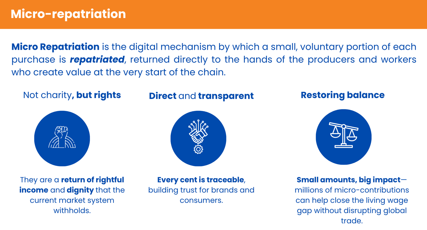 Extraction treats smallholders and workers as resources, from whom efficiency and profit must be squeezed, often leaving them behind in poverty.  Repatriation, on the other hand, recognizes their foundational role and ensures that value flows back to those who generate it. Micro-repatriation is the mechanism that makes this practical, visible, and scalable: a direct, transparent return of value to the producers, farmers, and labourers who are all too often excluded from the upside of global trade.
